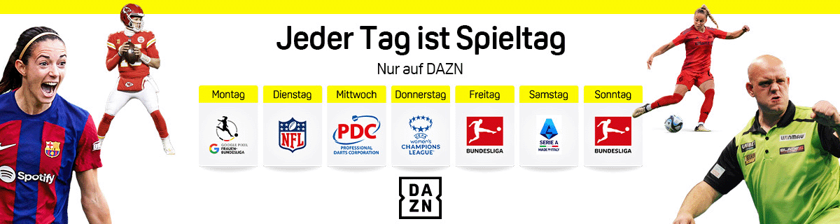 DAZN zeigt alle Freitags- und Sonntagsspiele der Bundesliga (103 exklusive Einzelspiele), nahezu die komplette UEFA Champions League inklusive der Konferenz (121 von 138 Spiele live und exklusiv), sowie weiteren Spitzenfußball der europäischen Topligen und Pokalwettbewerbe wie La Liga, SerieA, Ligue1 oder dem FA Cup. Außerdem bietet dir DAZN den besten US-Sport mit NBA, NFL und NCAA, Feldhockey, Boxen und das Beste der MMA mit der UFC, die umfangreichste Darts-Berichterstattung aller Zeiten sowie über Eurosport 1HD und Eurosport 2HD die Olympischen Spiele, den besten Wintersport mit u.a. dem FIS Alpine Weltcup, der Vierschanzentournee und dem Biathlon-Weltcup, ausgewählte Tennis-Grand-Slams, Radsport und vieles mehr.