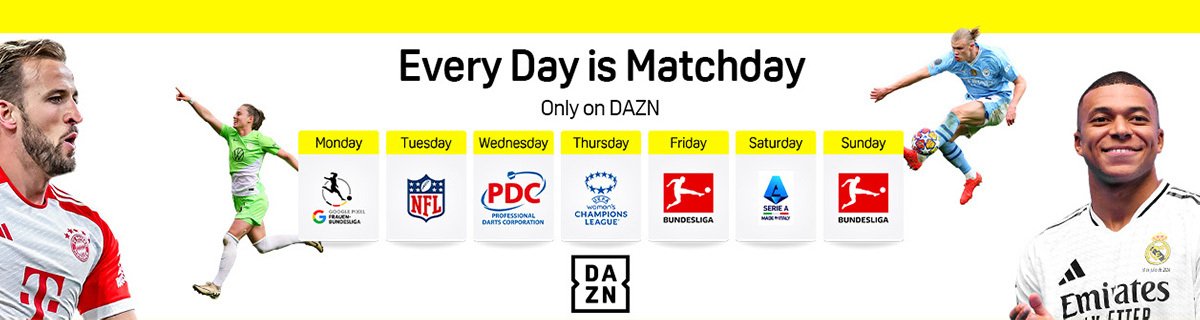 Only on DAZN, fans experience the Bundesliga Conference on Saturday & all Sunday matches, 186 matches of the UEFA Champions League, as well as European top leagues and cup competitions. Also the UEFA Women’s Champions League and the Women’s Bundesliga. In addition, the NFL, darts, handball, golf as well as combat sports with UFC and boxing.