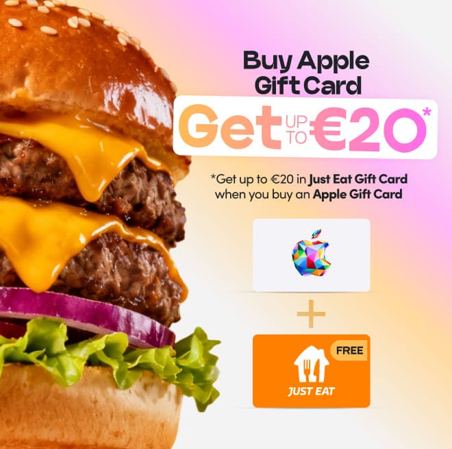 - Buy €100 or more Apple gift Card, and get a €20 Just Eat voucher code